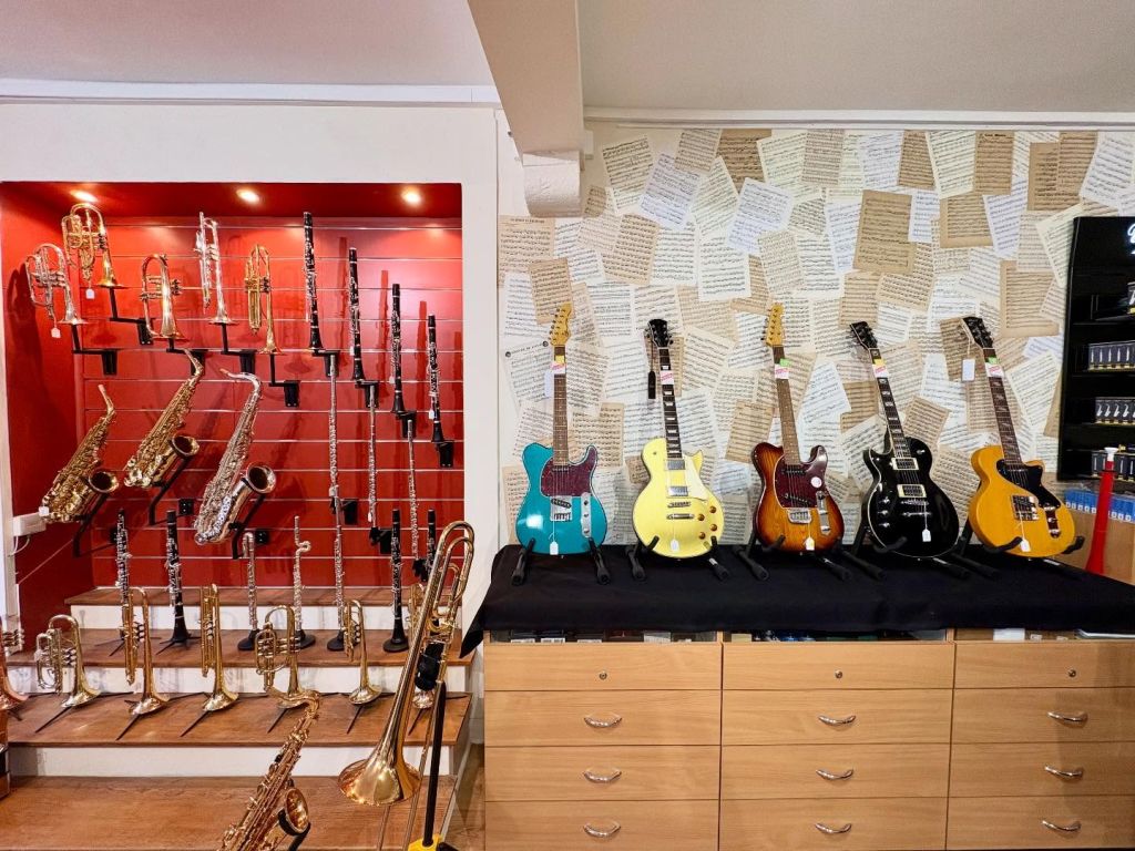 Vous pourrez profiter d'une belle exposition de guitares électriques, de guitares basses, de percussions et d'amplis qui se situe dans notre cave aménagée, vous permettant ainsi d'essayer ces instruments dans un cadre atypique.